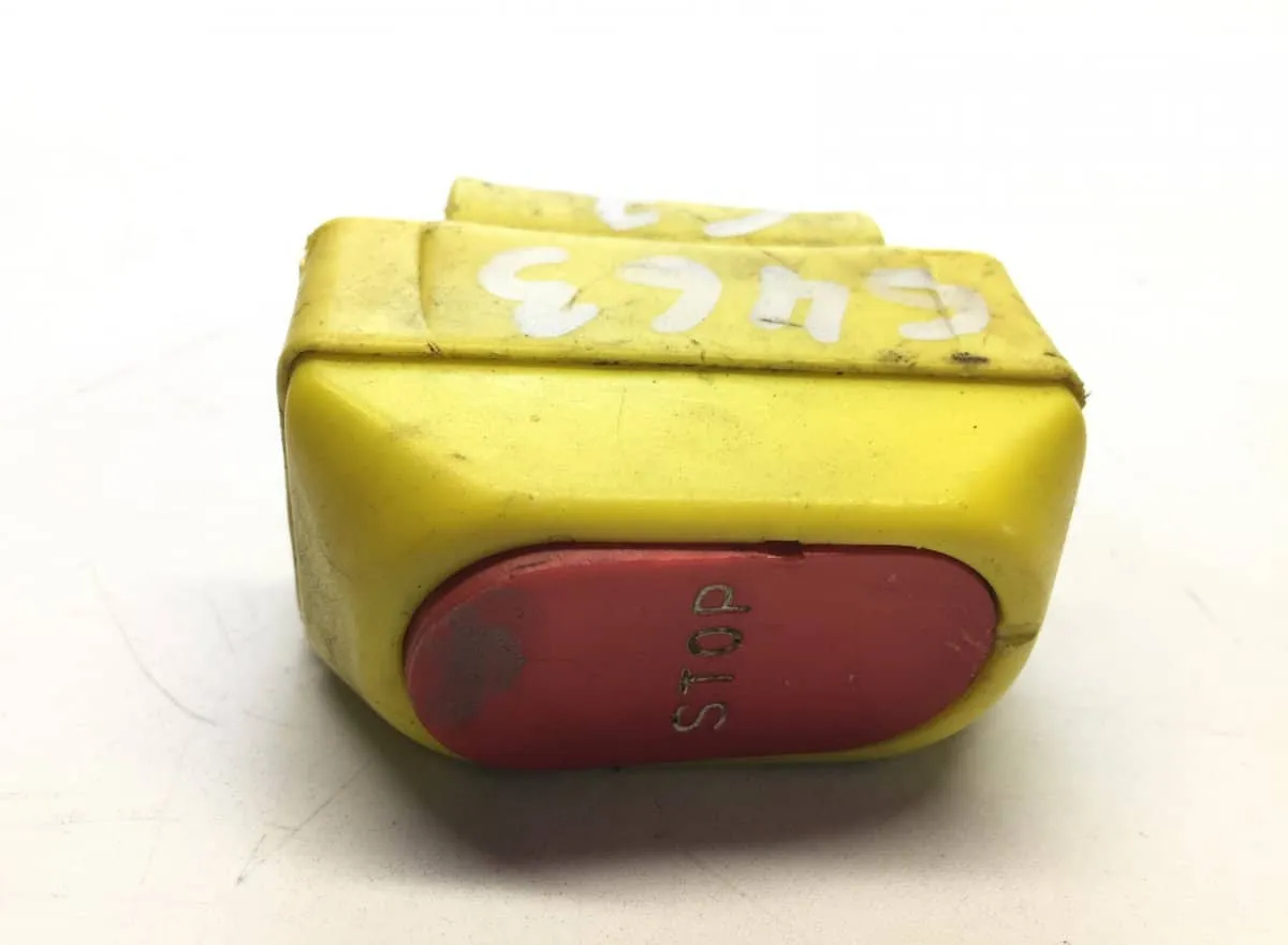 Acest produs este un buton de stop pentru Volvo, având codul 20753328-14. Carcasa sa este de culoare galbenă, iar butonul propriu-zis este roșu, cu inscripția „STOP” gravată pe suprafața sa. Butonul pare să fie utilizat și prezintă semne ușoare de uzură. Este conceput pentru a fi montat pe vehicule Volvo și este esențial pentru funcționarea corectă și sigură a sistemului de oprire.