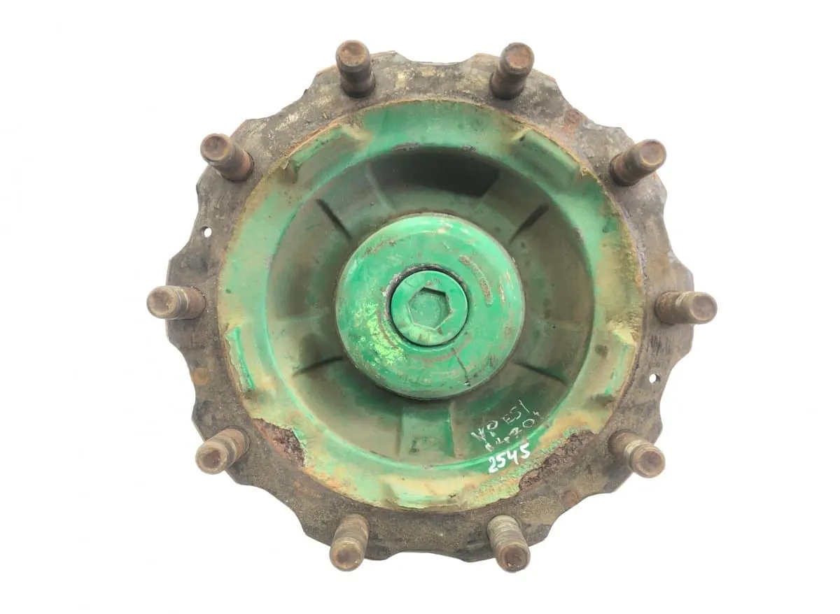 Acest butuc de roată cu tambur de frână este destinat axei față stânga pentru camioanele Scania. Este fabricat din metal durabil, având o culoare verde cu urme evidente de uzură, indicând utilizarea anterioară. Include șuruburile necesare pentru fixare și este compatibil cu mai multe modele de piese Scania listate mai sus.