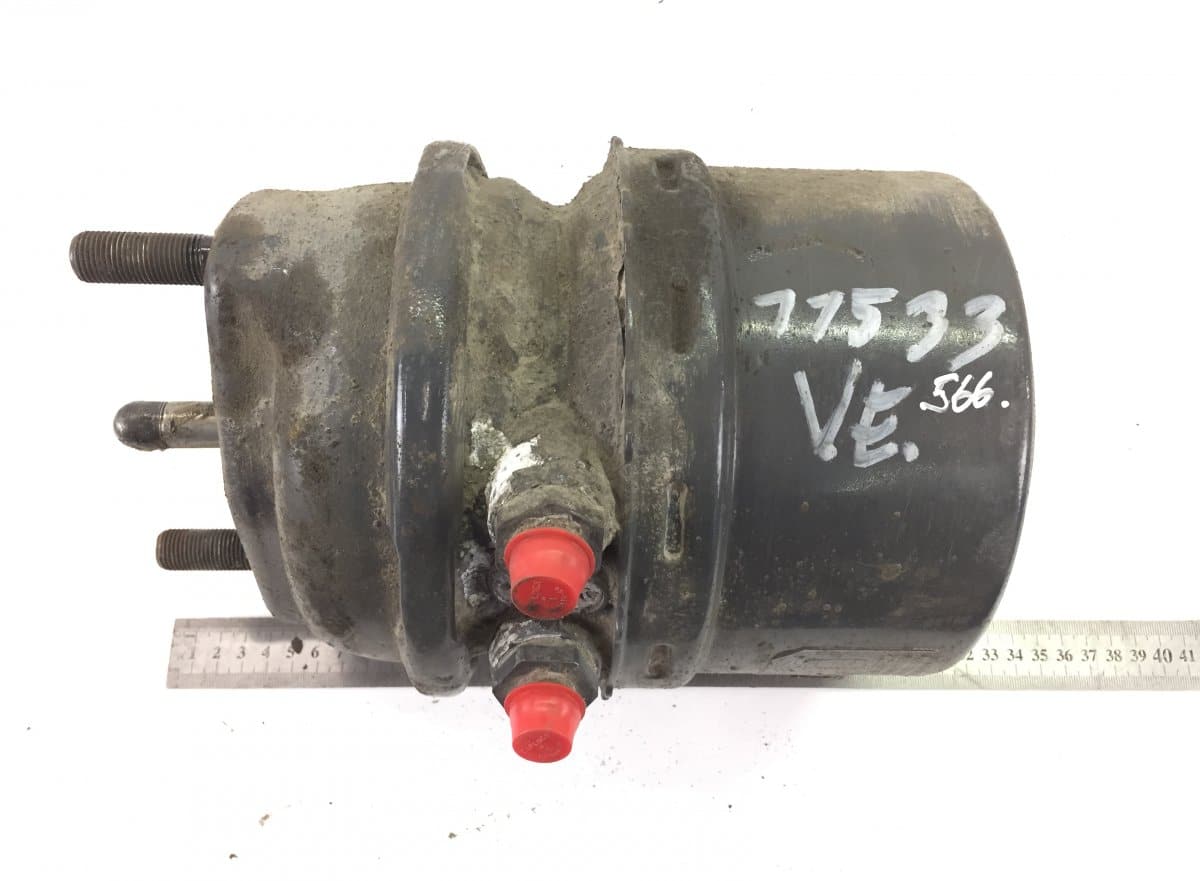 Produsul prezentat este un exemplu de cameră de frânare folosită, cu semne vizibile de uzură și cu inscripții pe carcasă. Conexiunile sunt protejate de capace roșii, iar dimensiunile sunt indicate cu ajutorul unei rigle în imagine.