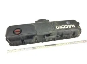 Acest capac de culbutori este compatibil cu vehiculele DAF și are codul de piesă 1733167. Este un produs utilizat, cu semne vizibile de uzură și murdărie, dar în stare funcțională. Pe capac se pot observa inscripții și marcaje specifice. Dimensiunile sunt aproximativ de 50 cm lungime, conform riglei din imagine.