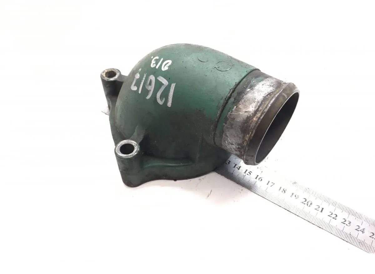 Carcasa pentru termostat compatibilă cu modelele Volvo, având codurile de referință 21519562, 21611266, 21861948 și 21905526. Aceasta este realizată dintr-un material durabil, prezentând o suprafață verde și semne de uzură, fiind evident utilizată anterior. Dimensiunile produsului sunt clar marcate cu o riglă în imagine, indicând o lungime aproximativă de 16 cm. Este ideală pentru înlocuirea componentelor uzate sau defecte din sistemul de răcire al vehiculului.