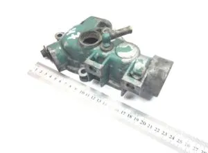 Carcasa termostat Volvo 8192924 este un component esențial pentru sistemul de răcire al motorului. Fabricată din metal durabil, aceasta asigură o funcționare optimă și o durată de viață extinsă. Carcasa prezintă semne vizibile de uzură și vopsea exfoliată, ceea ce indică utilizarea anterioară, dar este încă funcțională.