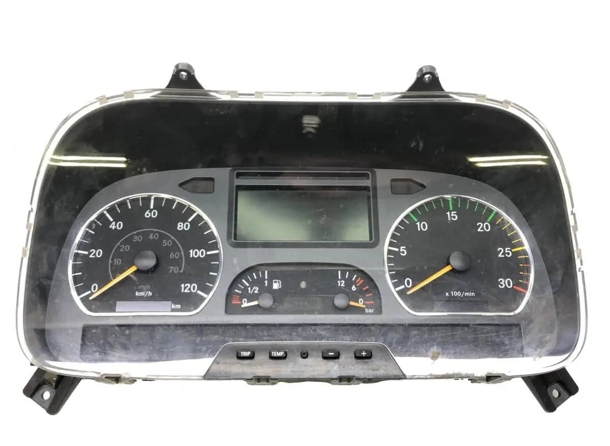 Ceas de bord pentru Mercedes Actros MP2, MP3 și Axor 2013. Acesta include un afișaj digital central și multiple cadrane analogice pentru vitezometru, tahometru, nivelul combustibilului și presiunea uleiului. Cu butoane pentru setarea traseului și a temperaturii, acest ceas de bord este esențial pentru monitorizarea parametrilor vehiculului.