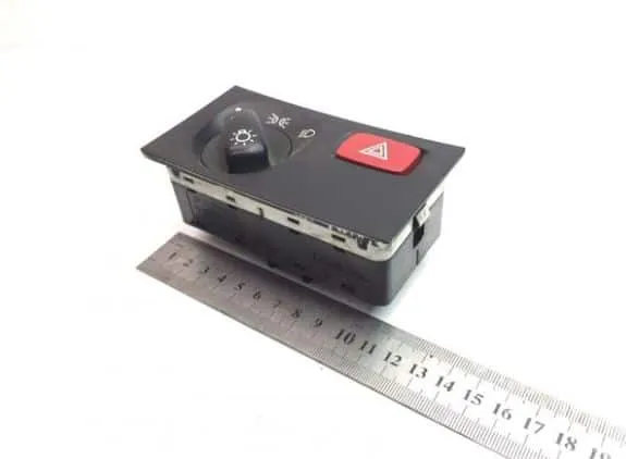 Comutatorul de lumini Scania 2252076 este un dispozitiv de control esențial pentru vehiculele Scania. Acesta include un buton rotativ pentru reglarea farurilor și un buton roșu pentru avarii. Dimensiunile sale sunt potrivite pentru instalarea în panoul de bord al vehiculului, conform scalei de pe rigla din imagine. Produsul este construit din materiale durabile și este proiectat pentru a oferi o funcționare fiabilă și de lungă durată.