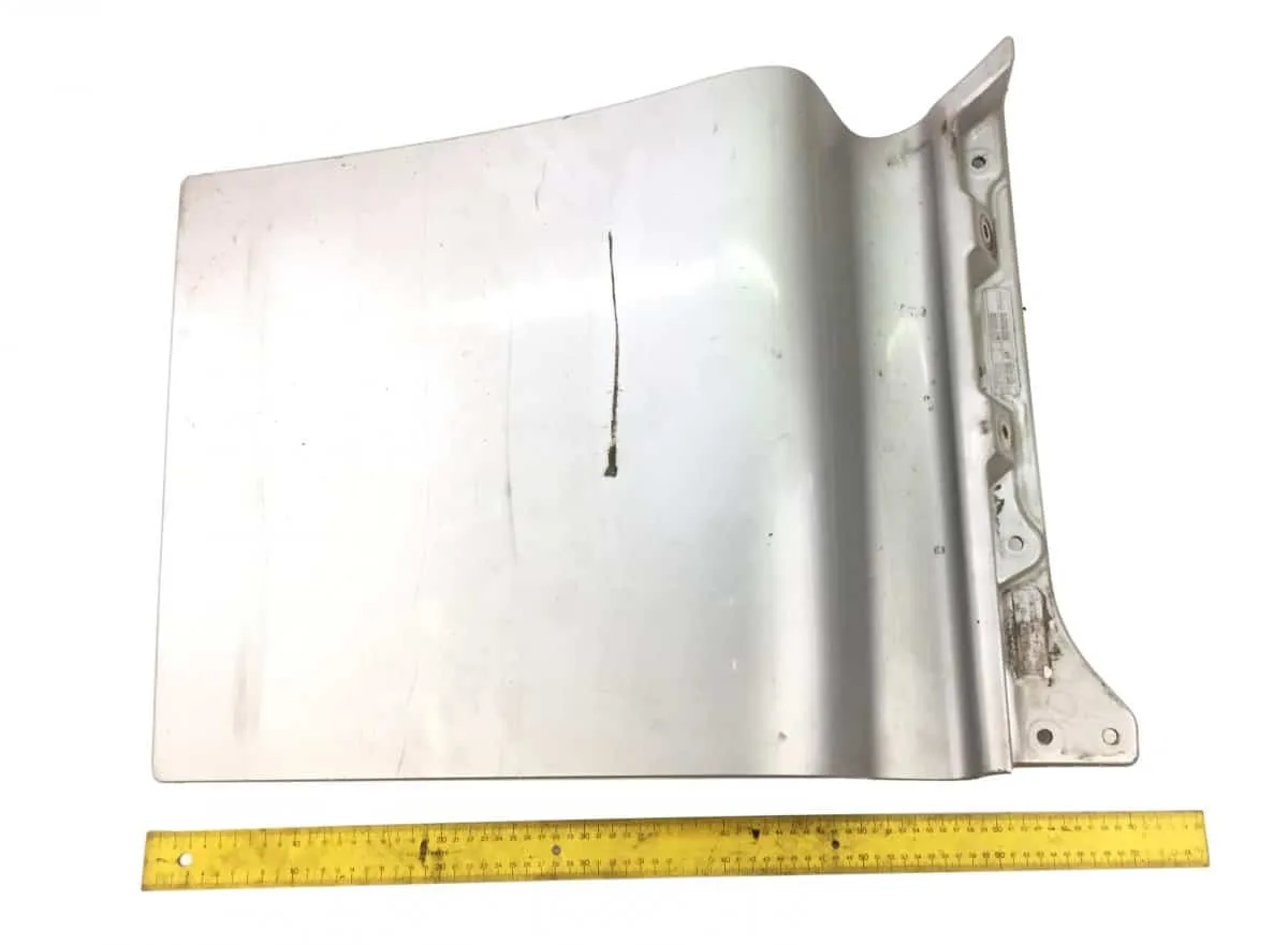 Extensie ușă dreaptă pentru vehiculele MAN, coduri: 81626100020 și 81626100032. Aceasta piesă de caroserie este de culoare albă și prezintă o construcție robustă din metal, asigurând durabilitate și rezistență în timp. Dimensiunile produsului sunt specificate prin prezența unei rigle de măsurare în imagine, oferind o perspectivă clară asupra dimensiunilor exacte. Ideală pentru înlocuirea componentelor uzate sau avariate, această extensie de ușă este compatibilă cu diverse modele de camioane MAN.