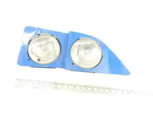 Far dreapta pentru Volvo, coduri de referință: 304-113704, 14001250, 30051409, 19360416100-11. Produsul constă dintr-o carcasă albastră, ce conține două faruri rotunde. Dimensiunile aproximative sunt indicate de o riglă standard de 50 cm, plasată în partea inferioară a imaginii.