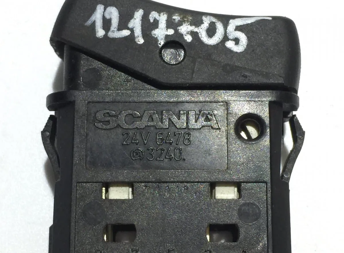 Acest întrerupător Scania este un produs de înaltă calitate, destinat vehiculelor Scania. Este compatibil cu tensiunea de 24V și are codul de identificare 6478, inscripționat clar pe carcasă. Întrerupătorul este robust și durabil, fiind potrivit pentru diverse aplicații în vehicule comerciale. Codul „3240” indică o specificație tehnică suplimentară. Produsul prezintă și un marcaj suplimentar „1217-05” scris de mână pentru identificare internă sau serializare.