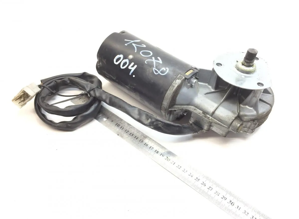 Motor ștergător parbriz pentru vehicule Scania. Compatibil cu codurile OEM 1505318 și 1432506. Motorul este în stare bună, având câteva semne de uzură exterioară, dar este complet funcțional. Include un cablu de conectare și o mufă pentru o instalare facilă. Dimensiunea motorului poate fi apreciată în raport cu rigla din imagine, care indică o lungime de aproximativ 30 cm.