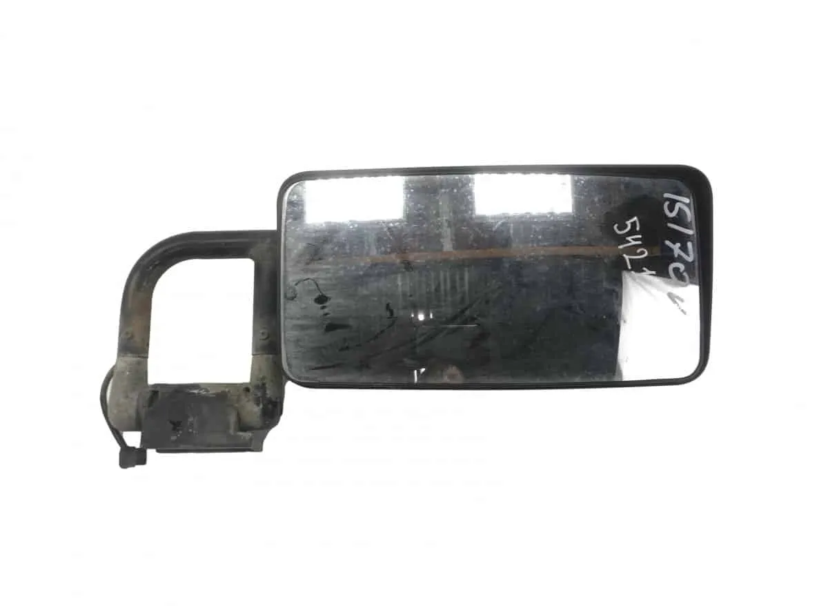 Oglindă retrovizoare stânga pentru Volvo, cod 70331940, 70309628-2. Oglinda este într-o stare uzată, cu urme vizibile de zgârieturi și murdărie pe suprafața acesteia. Rama oglinzii și suportul de prindere prezintă semne de uzură și rugină.