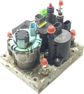 Pompa este montată pe o placă de bază robustă, având multiple conexiuni electrice și hidraulice pentru integrarea ușoară în sistemul vehiculului. Are mai multe porturi de conectare cu capace de protecție roșii pentru a preveni contaminarea. Componenta din imagine pare să fie deja utilizată sau recondiționată, având urme vizibile de uzură pe suprafață.