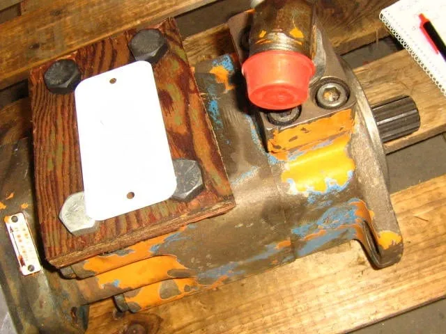 Pompă hidraulică de vânzare, cod de referință: 35VOTBPVE19RC. Piesa prezintă urme de uzură externă, dar este în stare de funcționare. Este realizată dintr-un material rezistent, cu finisaj de culoare galbenă și albastră. Pompa este prevăzută cu un capac de protecție din lemn și patru șuruburi de fixare. Este ideală pentru aplicații industriale și utilaje care necesită un sistem hidraulic robust și fiabil.