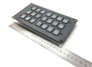 Dimensiunile panoului sunt aproximativ 16 cm lungime și 8 cm lățime, conform riglei standard din imagine. Designul compact și ergonomic permite o instalare facilă și o utilizare intuitivă, asigurându-se că toate funcțiile esențiale sunt la îndemână.