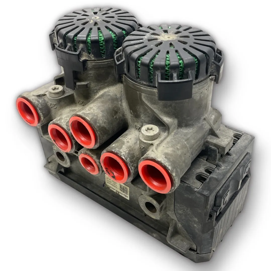 Aceasta este o supapă EBS pentru axa motrică a camioanelor Volvo, caracterizată prin multiple intrări și ieșiri de aer, fiecare marcată cu un inel roșu pentru identificare ușoară. Supapa este robustă și durabilă, fiind potrivită pentru diverse modele de camioane Volvo.