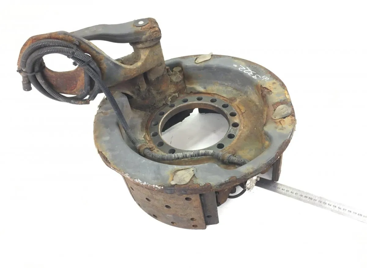 Acest suport de frână cu tambur este destinat pentru axa față stânga a vehiculelor Volvo. Componentele sunt uzate, prezentând urme vizibile de rugină și deteriorare, dar sunt funcționale. Produsul poate fi utilizat ca piesă de schimb pentru a înlocui componentele similare defecte de pe vehiculul dumneavoastră.