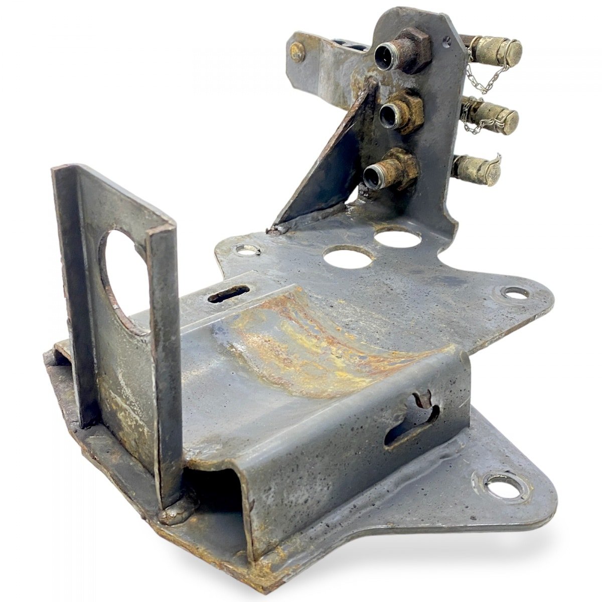 Acest suport este fabricat din metal robust și este conceput special pentru camioanele Scania. Prezintă multiple găuri pentru prindere și fixare, asigurând stabilitatea și durabilitatea necesare în utilizarea zilnică. Pe partea superioară, suportul are trei racorduri, fiecare prevăzut cu un capac de protecție, pentru atașarea diferitelor componente sau sisteme.