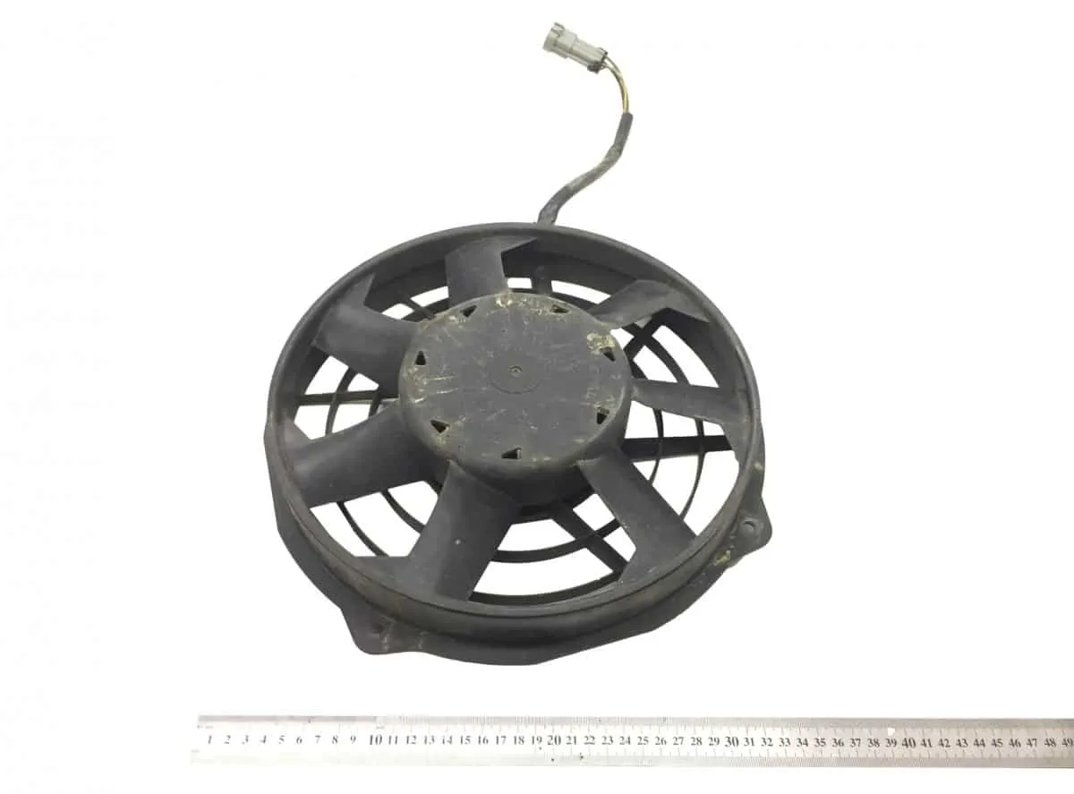 Ventilatorul de răcire AC pentru Volvo este un component esențial pentru menținerea temperaturii optime a motorului. Este compatibil cu codurile 21427047, 22360273 și 23731213. Produsul prezintă un design robust, cu 7 pale pentru un flux de aer eficient. Dimensiunile ventilatorului sunt indicate clar printr-o riglă alăturată, arătând un diametru de aproximativ 30 cm. Conectorul electric este situat în partea superioară, asigurând o instalare facilă și rapidă.
